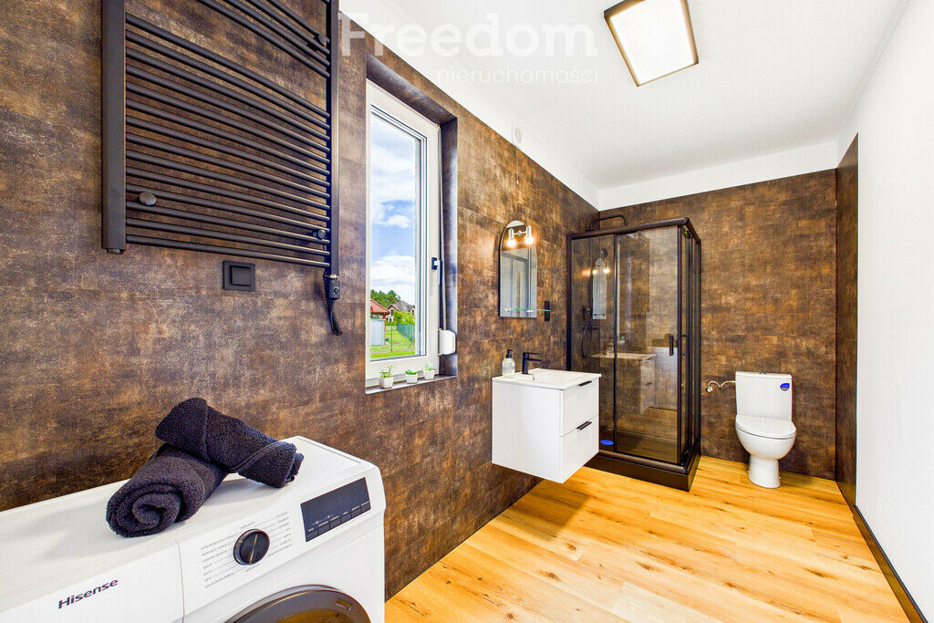 - wyposażenie łazienki: kabina prysznicowa, umywalka, WC, pralka,