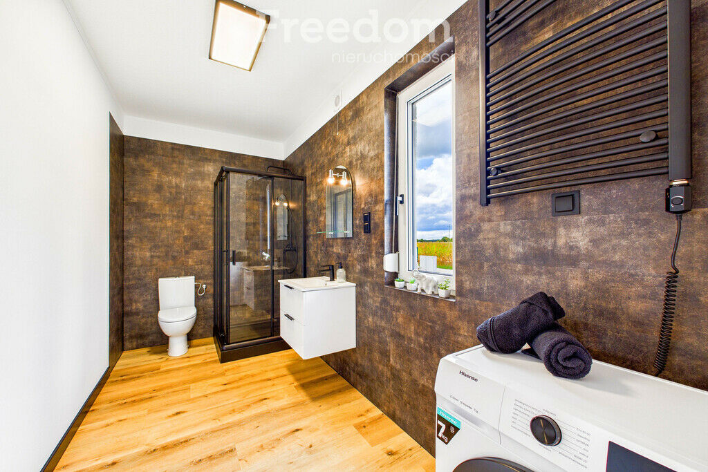 - wyposażenie łazienki: kabina prysznicowa, umywalka, WC, pralka,
